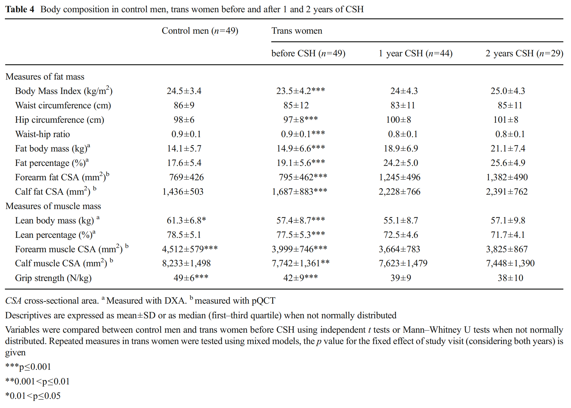 - Klaver, M., de Blok, C. J., Wiepjes, C. M., Nota, N. M., Dekker, M. J., de Mutsert, R., Schreiner, T., Fisher, A. D., T’Sjoen, G., & den Heijer, M. (2018). Changes in regional body fat, lean body mass and body shape in trans persons using cross-sex hormonal therapy: results from a multicenter prospective study. European Journal of Endocrinology, 178(2), 163–171. [DOI:10.1530/eje-17-0496]