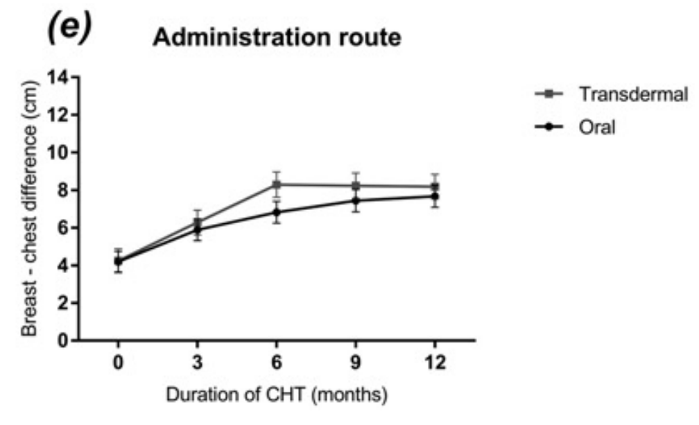 Transwomen treated with transdermal estradiol had a faster increase in breast-chest difference until 6 months after initializing treatment. However, breast development after 1 year of treatment did not differ between oral and transdermal estradiol administration [Fig. 5(e)].
